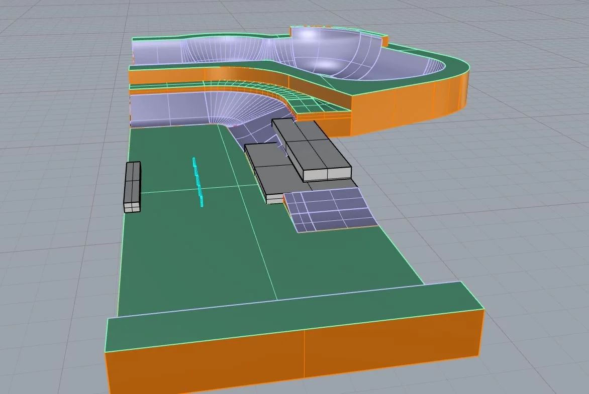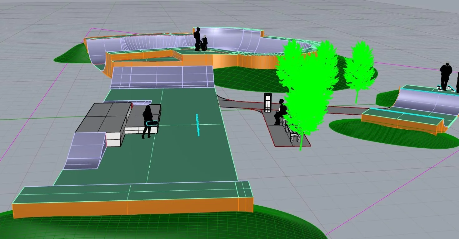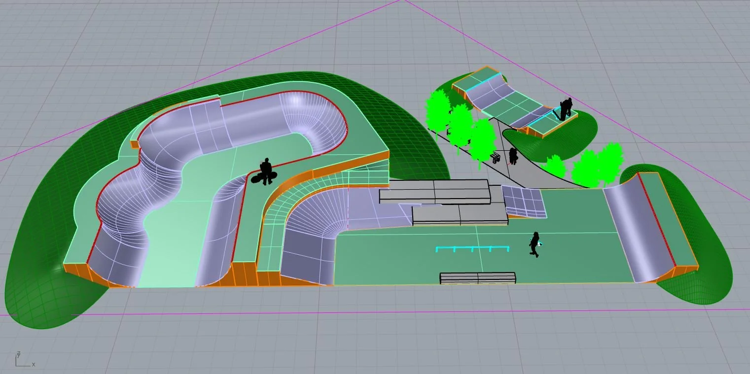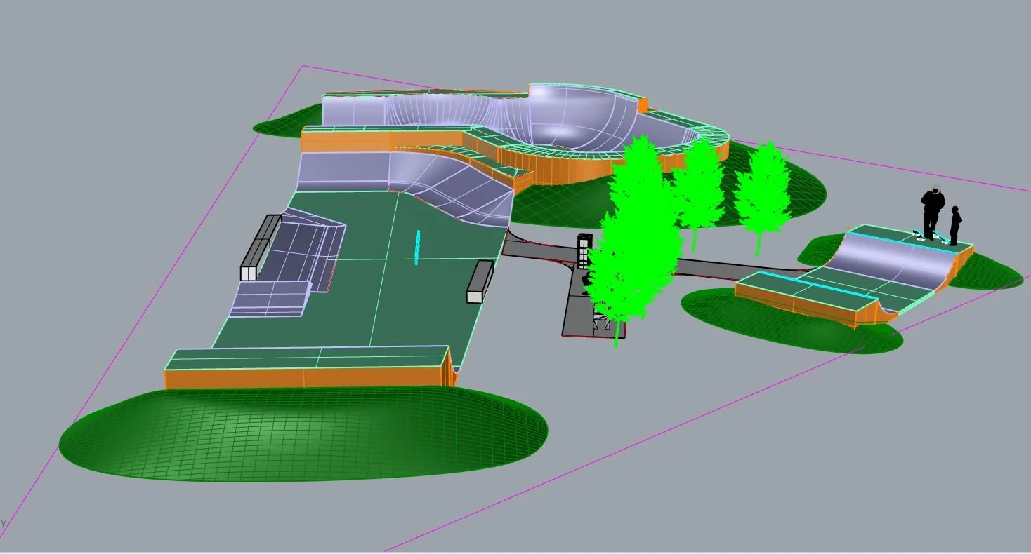 This is an exercise in space planning to show how the skatepark needs to fit into the space and the impact of the mounding, to inform any design revisions.
