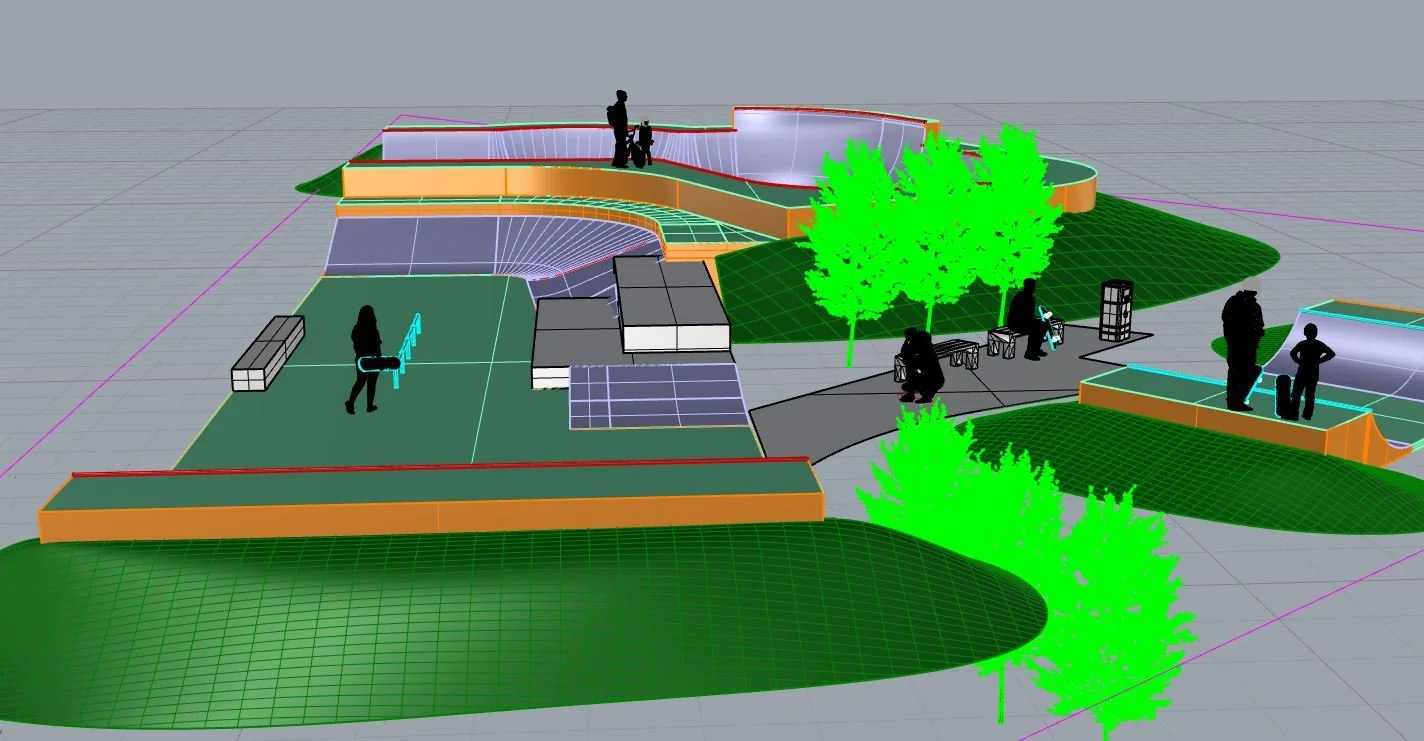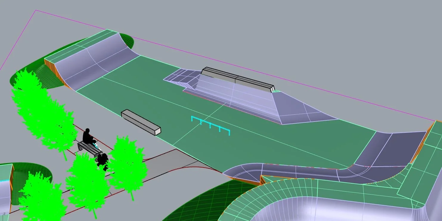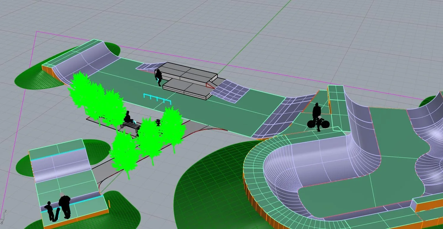 The below 3d interactive model includes annotations to explain various design iterations for the design based on consultation up to July 2025. We have been developing the design to include a deep bowl, whilst not being able to excavate into the ground, as the group are aware. With this, we have faced challenges that we have over come, for example mixing larger walls with smaller adjacent walls, whilst maintaining appropriate fall heights. Another area we have developed is the open/park area which is adjacent to the larger bowl forms and how the varied speeds and lines will interact with each other. Through the development of the design together, we have discovered the design developing into a flowy park and we have taken advantage of this by incorporating features that will add to the flow and compliment the general layout. We are really pleased with the flow and how the lines are working out with the latest iteration and feel that the general layout will work appropriately for the choice of forms, complimenting each other in lines and in isolation. We are seeing lots of interesting lines forming.
