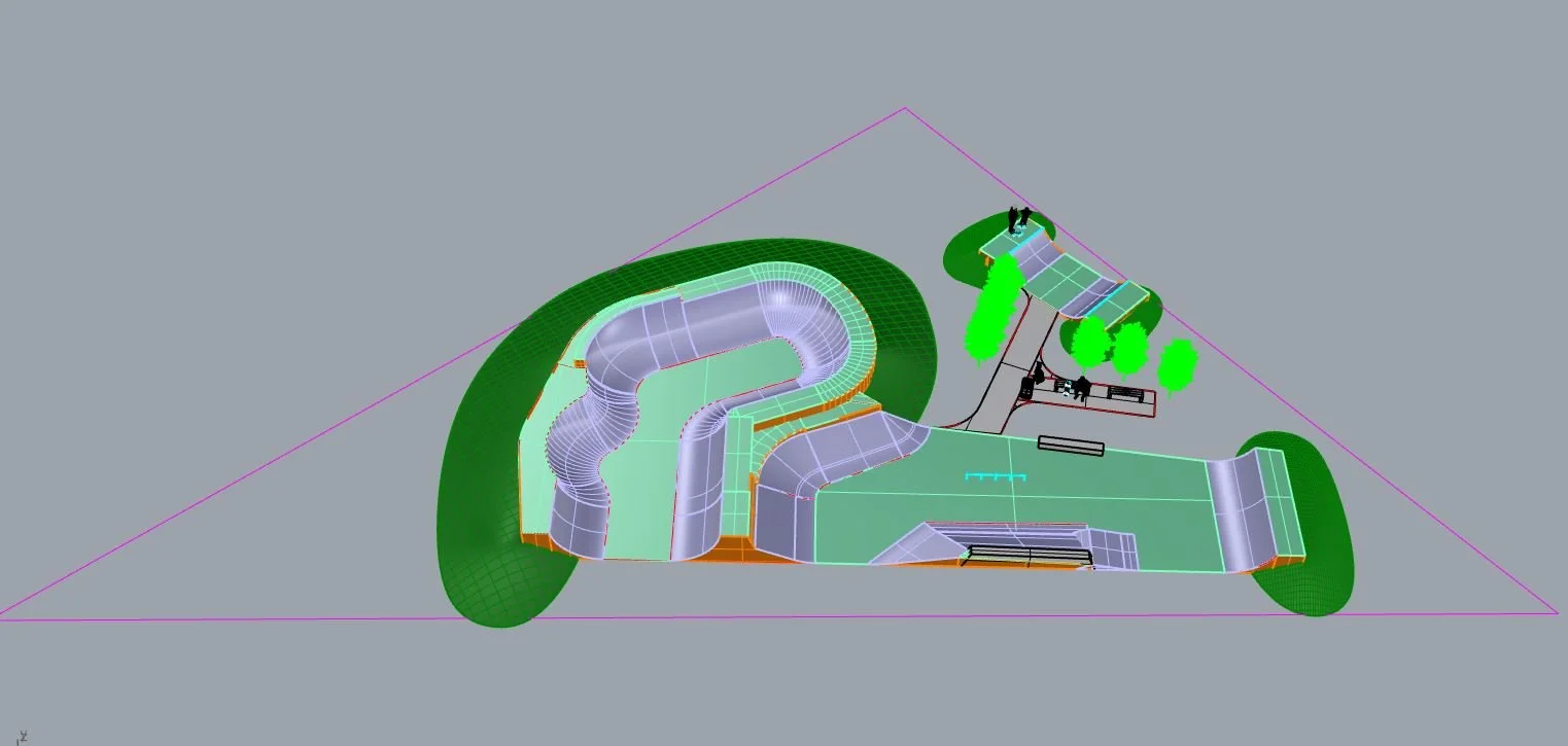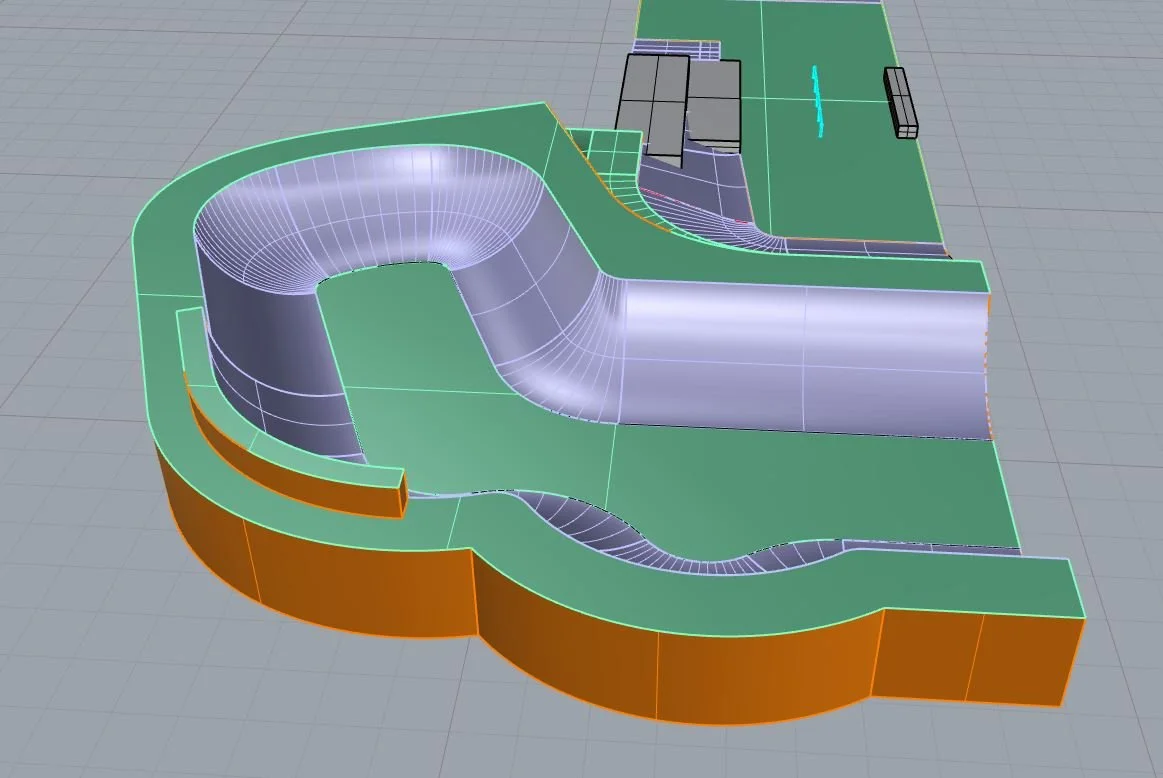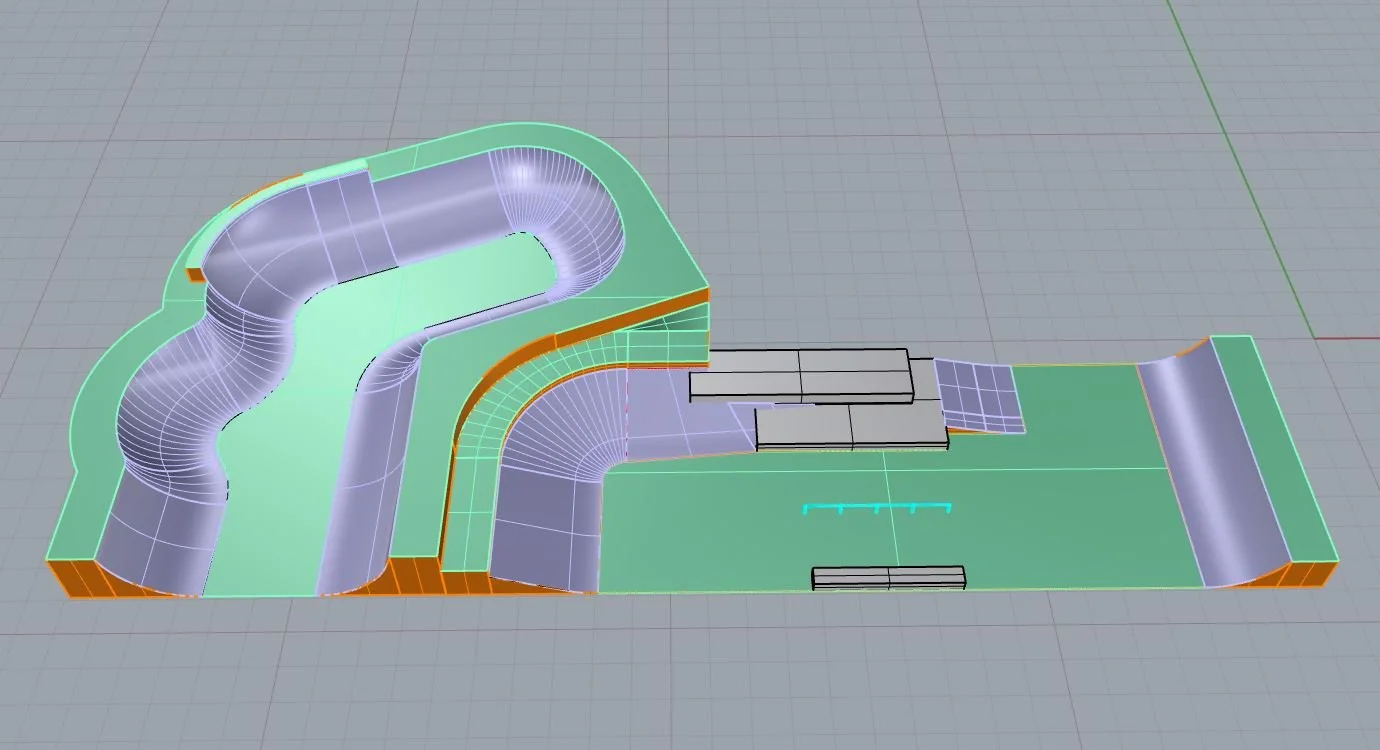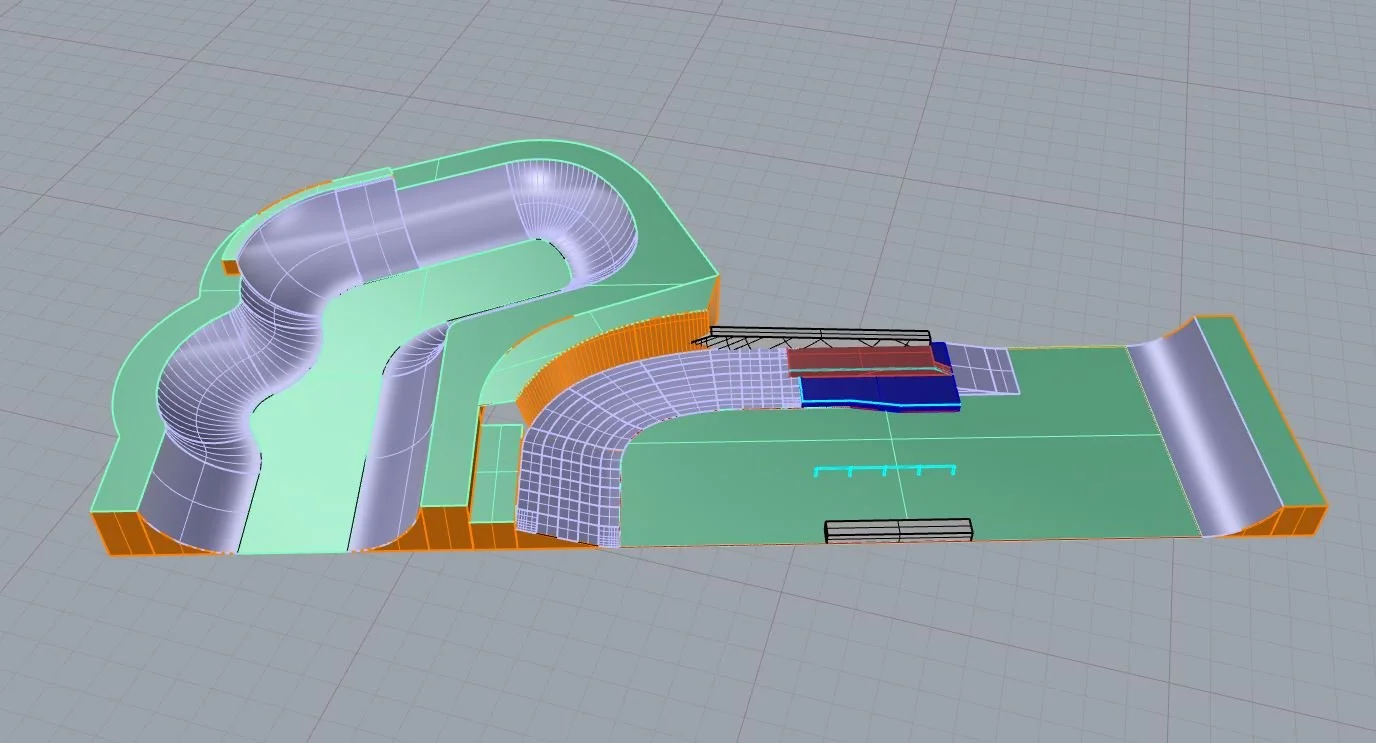 The below 3d interactive model includes annotations to explain various design iterations for the design based on consultation up to July 2025. We have been developing the design to include a deep bowl, whilst not being able to excavate into the ground, as the group are aware. With this, we have faced challenges that we have over come, for example mixing larger walls with smaller adjacent walls, whilst maintaining appropriate fall heights. Another area we have developed is the open/park area which is adjacent to the larger bowl forms and how the varied speeds and lines will interact with each other. Through the development of the design together, we have discovered the design developing into a flowy park and we have taken advantage of this by incorporating features that will add to the flow and compliment the general layout. We are really pleased with the flow and how the lines are working out with the latest iteration and feel that the general layout will work appropriately for the choice of forms, complimenting each other in lines and in isolation. We are seeing lots of interesting lines forming.