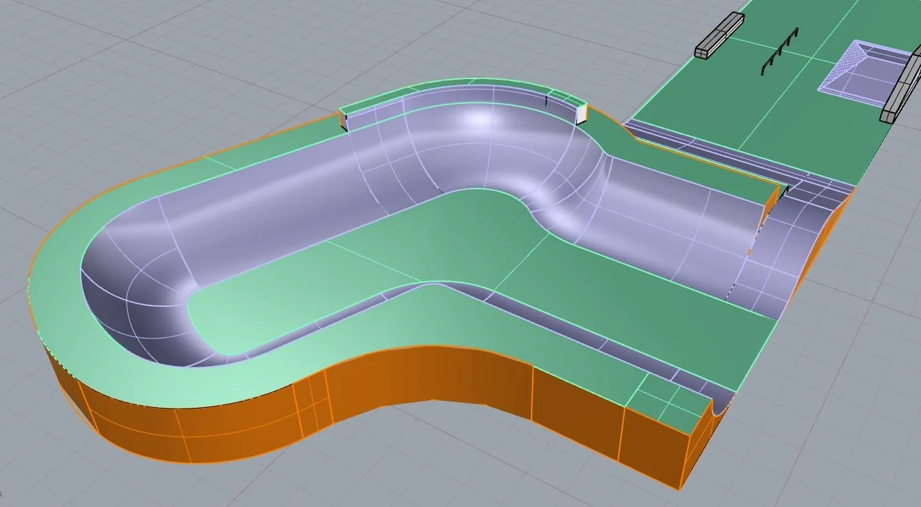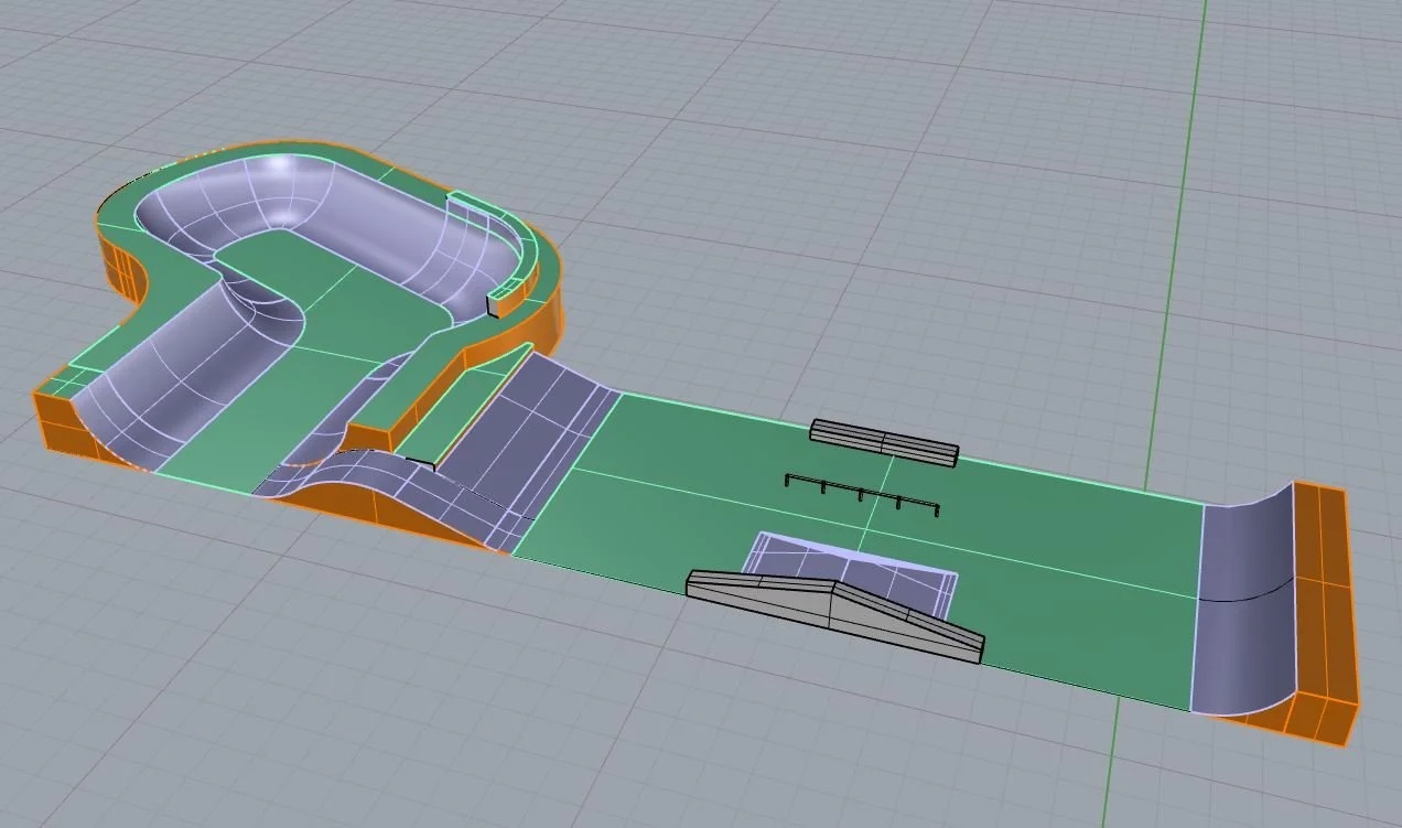 The bowl unrotated created a corner pocket within the street area - which can be an opportunity or a hinderance to the design. This bowl features an additional bowled corner which is less spacious, but adds more features, if this is required. To access the bowl is more difficult, seen by the walls at the top of the street-banks. The bowled corner within the street area is an example and would need development to fit within the narrower street area to compensate for the requested changes from the previous issued designs from last week.