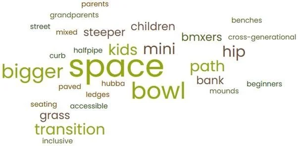 The comments that specifically related to the skatepark design included a request for a steep ramp for experienced riders and a curb for the older riders. Other respondents requested the coloured concrete should be removed, and that a dedicated space should be planned for younger users (to prevent collisions with the older users).