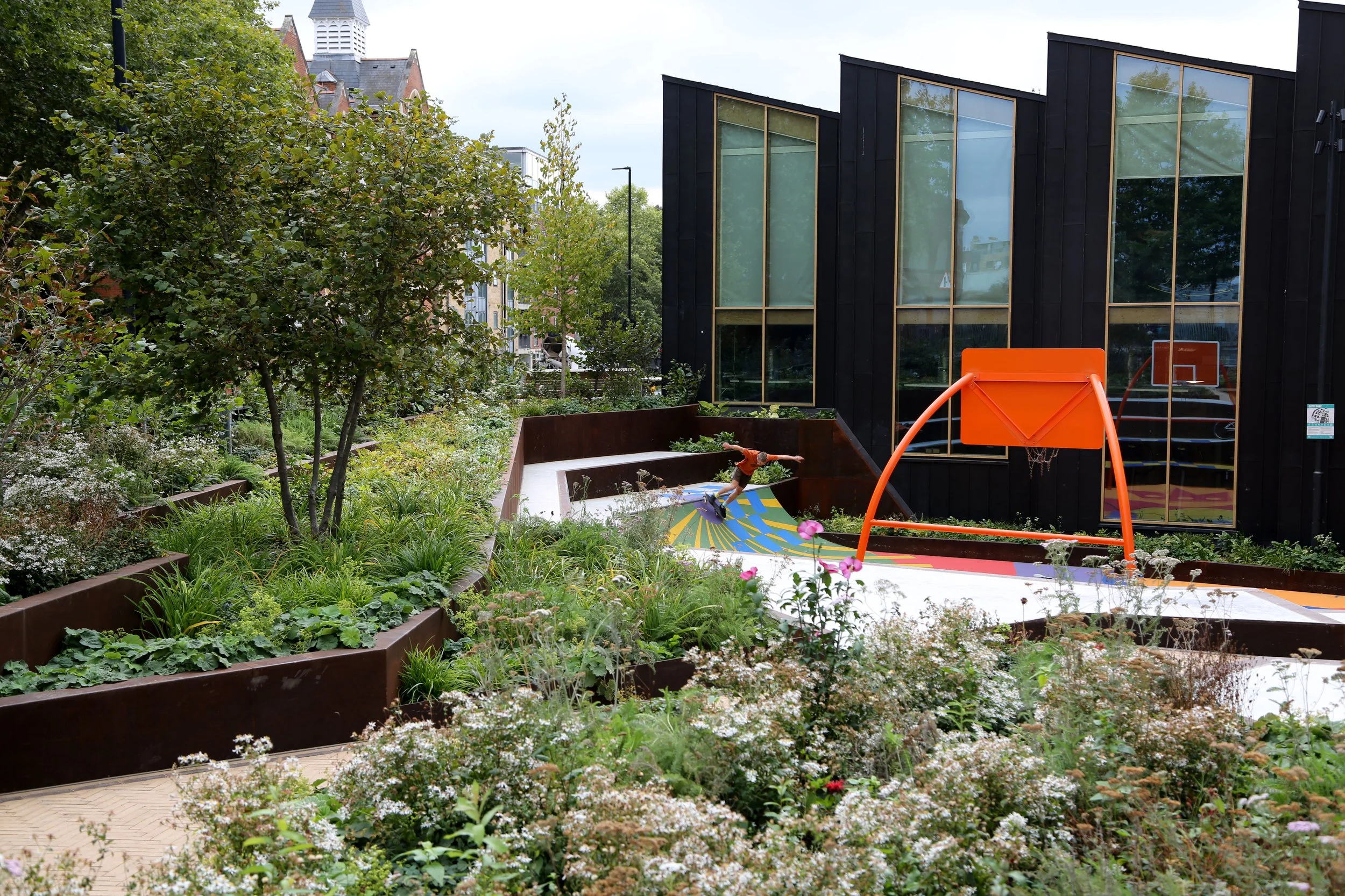 The completed facility blends social seating, skatepark elements, and ball sports areas into an inviting, multi-use environment. It stands as a case study in how wheeled sports can be successfully integrated into the public realm—balancing aesthetics, function, and community use.